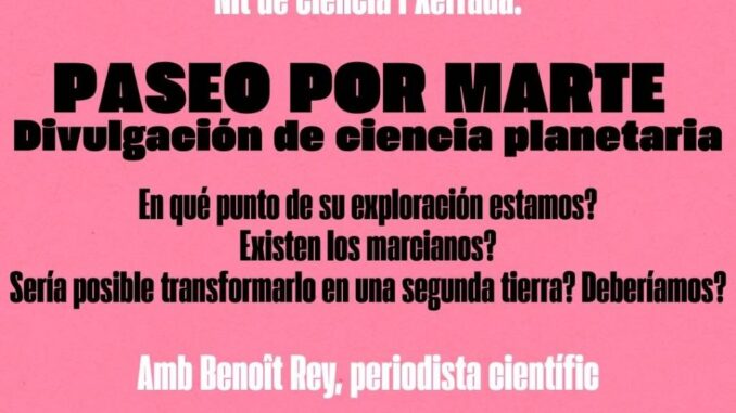Avui dijous 10 d’abril a les 20h farem una xerrada divulgativa de ciència planetària: Una passejada per Mart amb Benoît Rey, periodista científic.