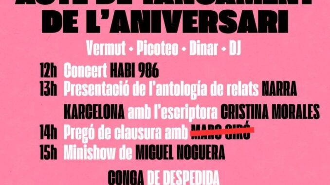 El diumenge 19 d’abril a partir de les 12h us convidem a un vermut al carrer amb música de la ma de Habi 986, tastet i la presentació de l’antologia de relats Narra Karcelona a càrrec de la Cristina Morales. També ens acompanyarà el Miguel Noguera fent un minishow.
