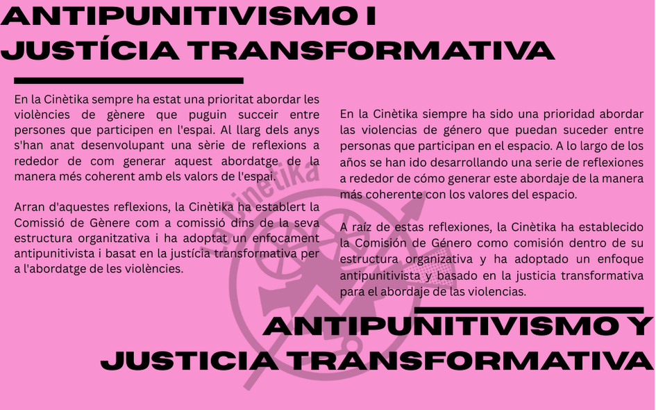 [CAST] Pese a que el enfoque feminista siempre ha sido una de las prioridades del espacio, a lo largo de los años y las experiencias adquiridas en la gestión de diferentes situaciones de violencia desde la Cinètika, se han ido desarrollando una serie de reflexiones y posicionamientos que han llevado a adoptar una perspectiva antipunitivista y basada en la justicia transformativa.