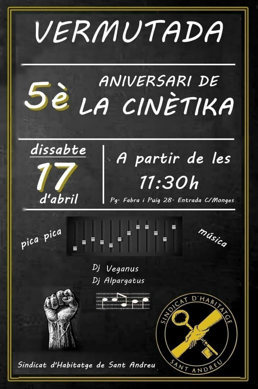 En motiu del 5è aniversari de La Cinètika el Sindicat d’Habitatge de Sant Andreu us conviden al vermut que hem organitzat. Serà avui dissabte 17 d’abril a les 11:30h. Hi haurà bona musica i pica-pica. Us hi esperem!