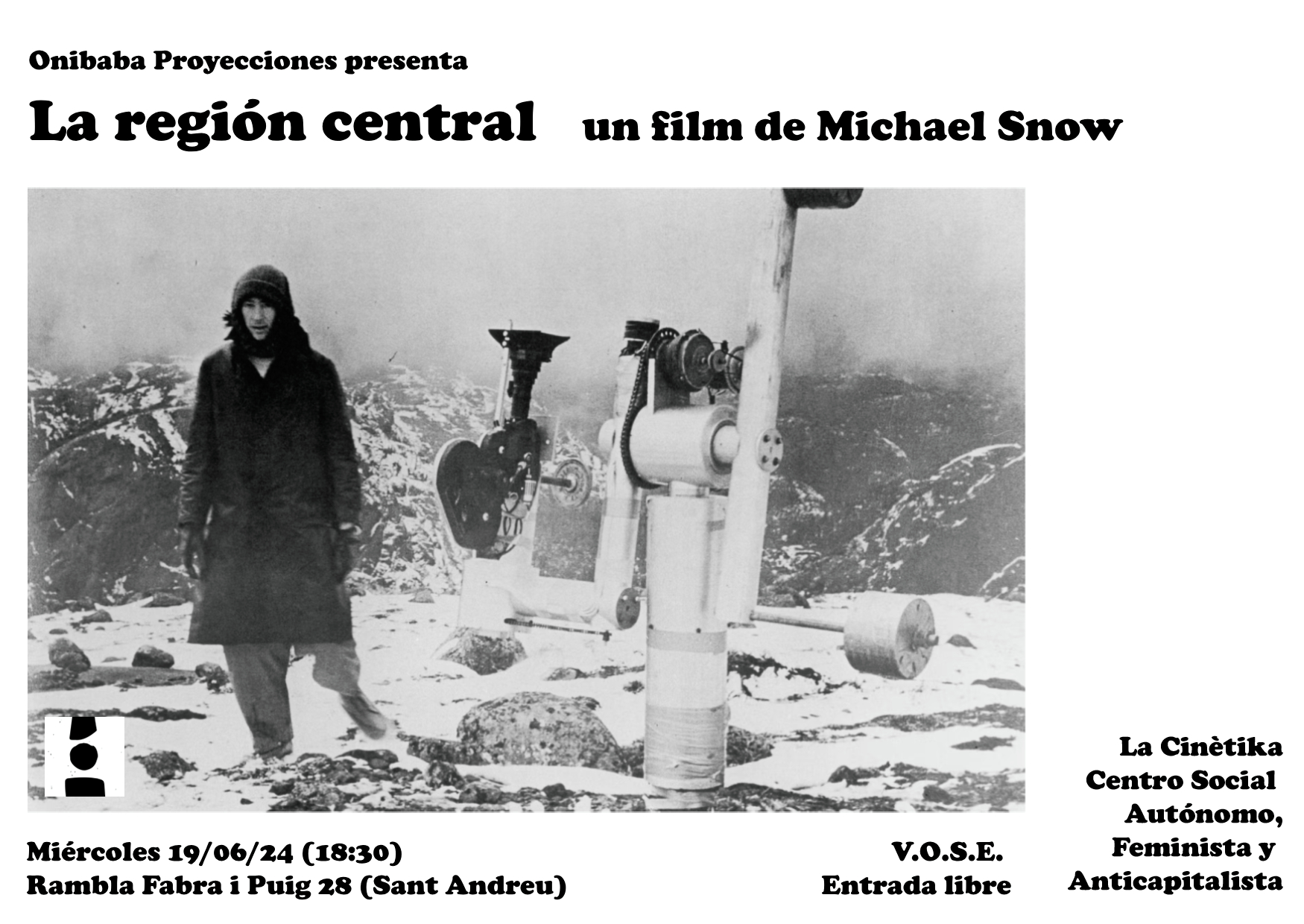 El dimecres 19 de juny a les 18:30h, Onibaba Proyecciones projectarà La región central, de 180 minuts de durada i dirigida per Michael Snow (1971). Al Canadà, enmig d’un desert nevat, un estrany artefacte filma el paisatge hivernal com mai abans s’ha fet. El resultat semblen imatges d’un planeta alienígena. […]