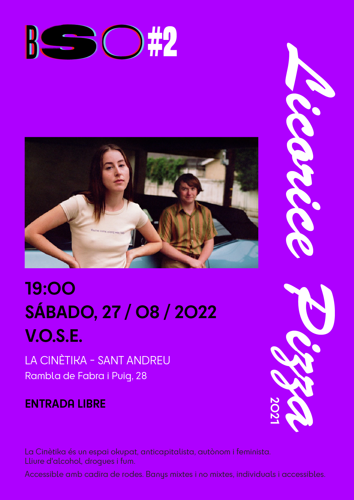 Dissabte 27 d’agost, 7:00pm., Sala 10. BSO#2: Licorice Pizza (2021) Licorice Pizza es una història d’amor i de (intentar superar) l’adolescència. La música, escollida pel mateix director (Paul Thomas Anderson) i Jonny Greenwood (Radiohead) compleix una doble funció. Per una banda, conté enormes cançons pop que encaixen a la perfecció […]