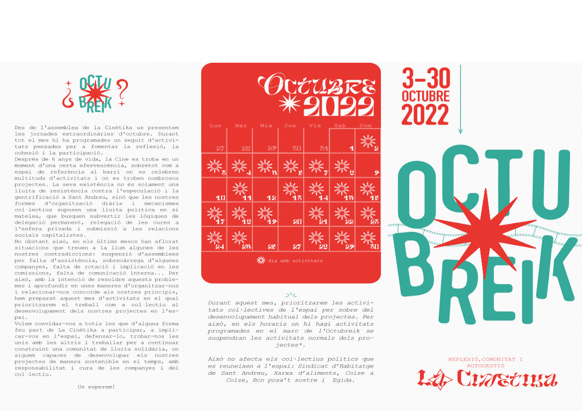 Des de l’assemblea de la Cinètika tenim el plaer de presentar les jornades extraordinàries d’octubre. Durant tot el mes hi ha programades un sense fi d’activitats pensades per a fomentar la reflexió, la cohesió i la participació.Si pensem en la Cinètika com un ens viu, podem assegurar que, després de […]