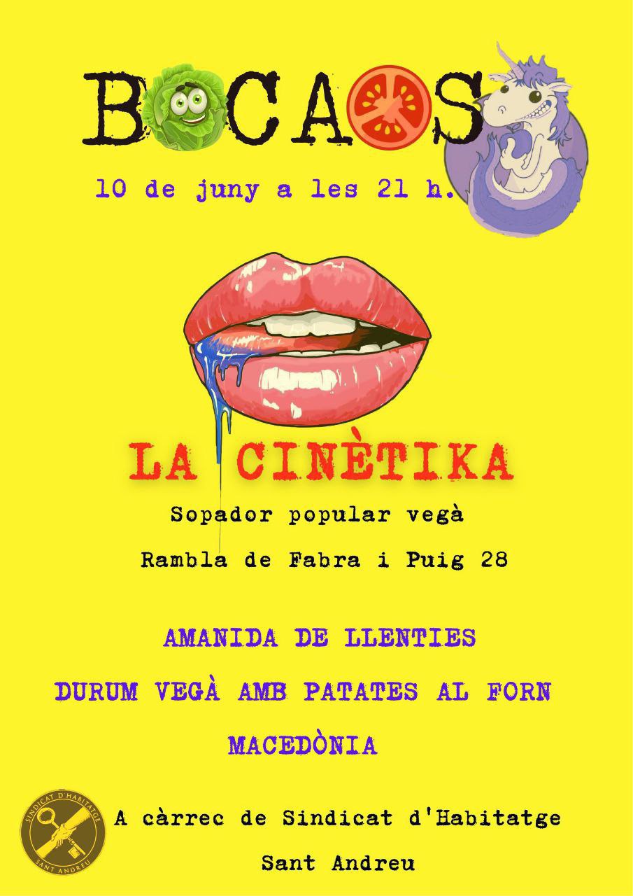 Serà el divendres 10 de juny, com sempre a les 21h després de la pel.lícula dels divendres, al hall d’entrada. Cuinarà el Sindicat d’Habitatge de Sant Andreu i, com sempre serà tot vegà i serà tot boníssim! T’ho perdràs?