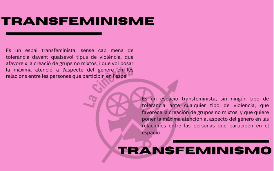 Por este motivo se decidió pasar a definir el espacio como transfeminista, y para no quedarnos en la simple definición y ser coherentes, se acordó por un lado contactar con diferentes colectivos transfeministas y LGTBQ+ para ofrecer el espacio para actividades, asambleas u otro tipo de actividades. También, se decidió realizar una serie de jornadas internas de formación para elaborar el posicionamiento transfeminista, y de esta manera reafirmar que la Cinètika es un espacio que quiere acoger a todas las identidades y expresiones de género, y que hace de la lucha transfeminista uno de sus principales objetivos.