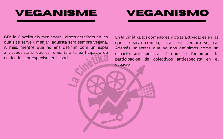 [CAT]La Cinètika pretén ser un espai lliure de maltractament animal, ja que som un centre social conscient de l’abús que s’exerceix en la societat actual sobre els animals, i com aquest és potenciat pel model capitalista. Per això, es va prendre la decisió des dels inicis de l’okupació que en aquest espai no es consumiria menjar d’origen animal, i que en tots els menjadors el menjar que se serviria seria sempre vegana.